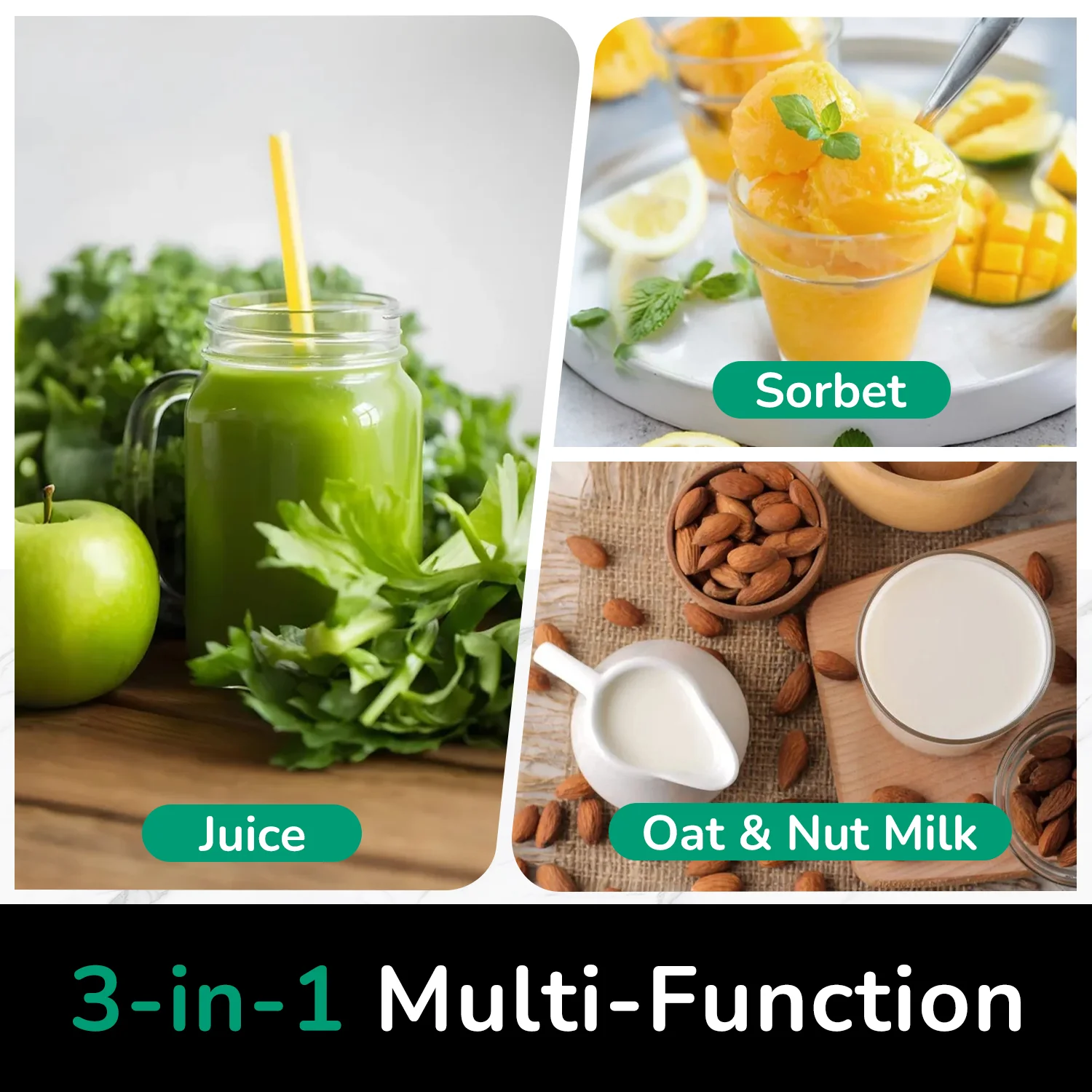 - Multifunctional Design: This 3-in-1 slow masticating juicer creates cold-pressed juice, nut milk, and sorbets, maximizing nutrient retention.