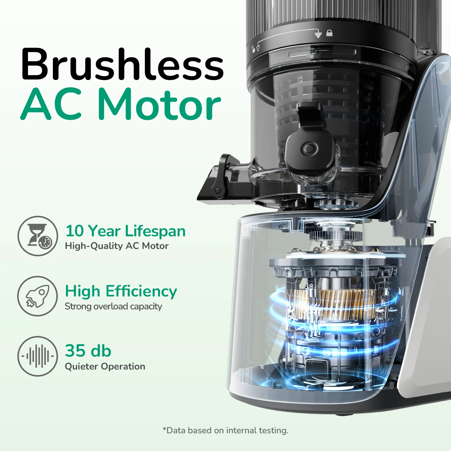 - Quiet Operation: The 250W brushless motor operates quietly while effectively processing hard produce and leafy greens.